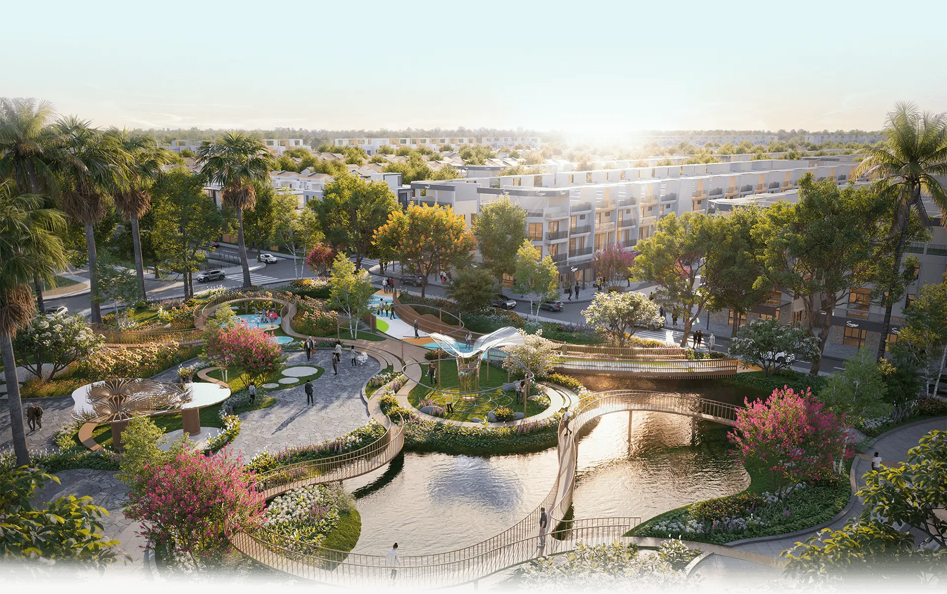 Không gian xanh được chú trọng với công viên trung tâm rộng 2,2 ha cùng hệ thống kênh và cảnh quan ven kênh đan xen, tạo nên “lá phổi xanh” giữa lòng đô thị. Yếu tố xanh đan xen giữa các tiện ích đô thị, giúp cư dân tận hưởng cảm giác gần gũi thiên nhiên trong đời sống hàng ngày mà không tách rời những tiện nghi hiện đại. Thiết kế mở, mật độ xây dựng thấp, cùng hệ thống giao thông nội khu hợp lý góp phần duy trì sự thông thoáng và tối ưu hóa trải nghiệm sống.
